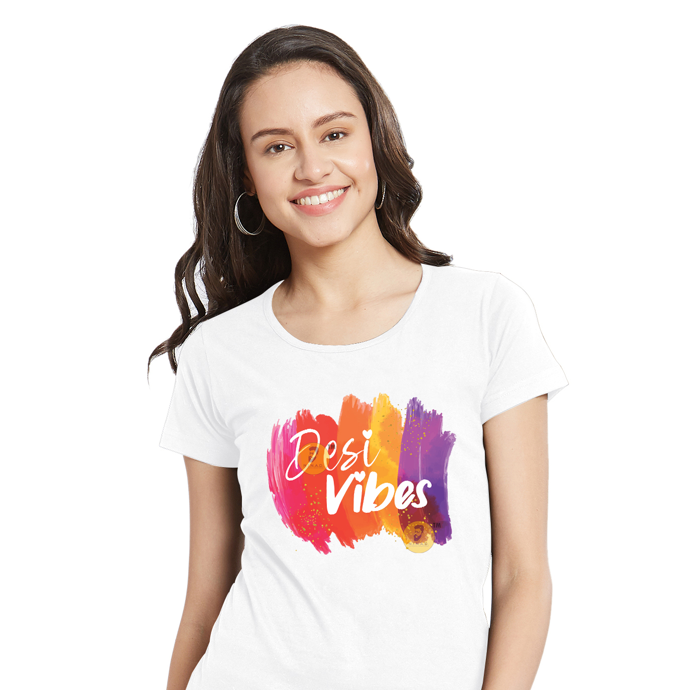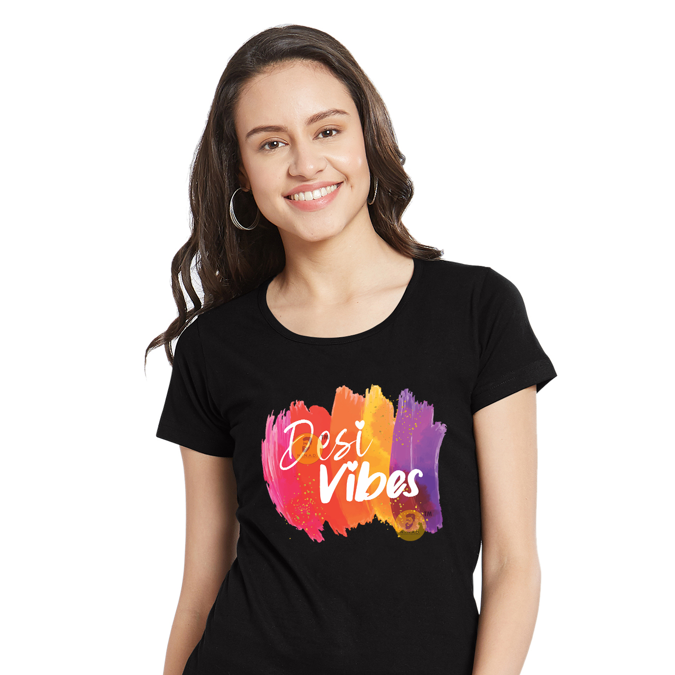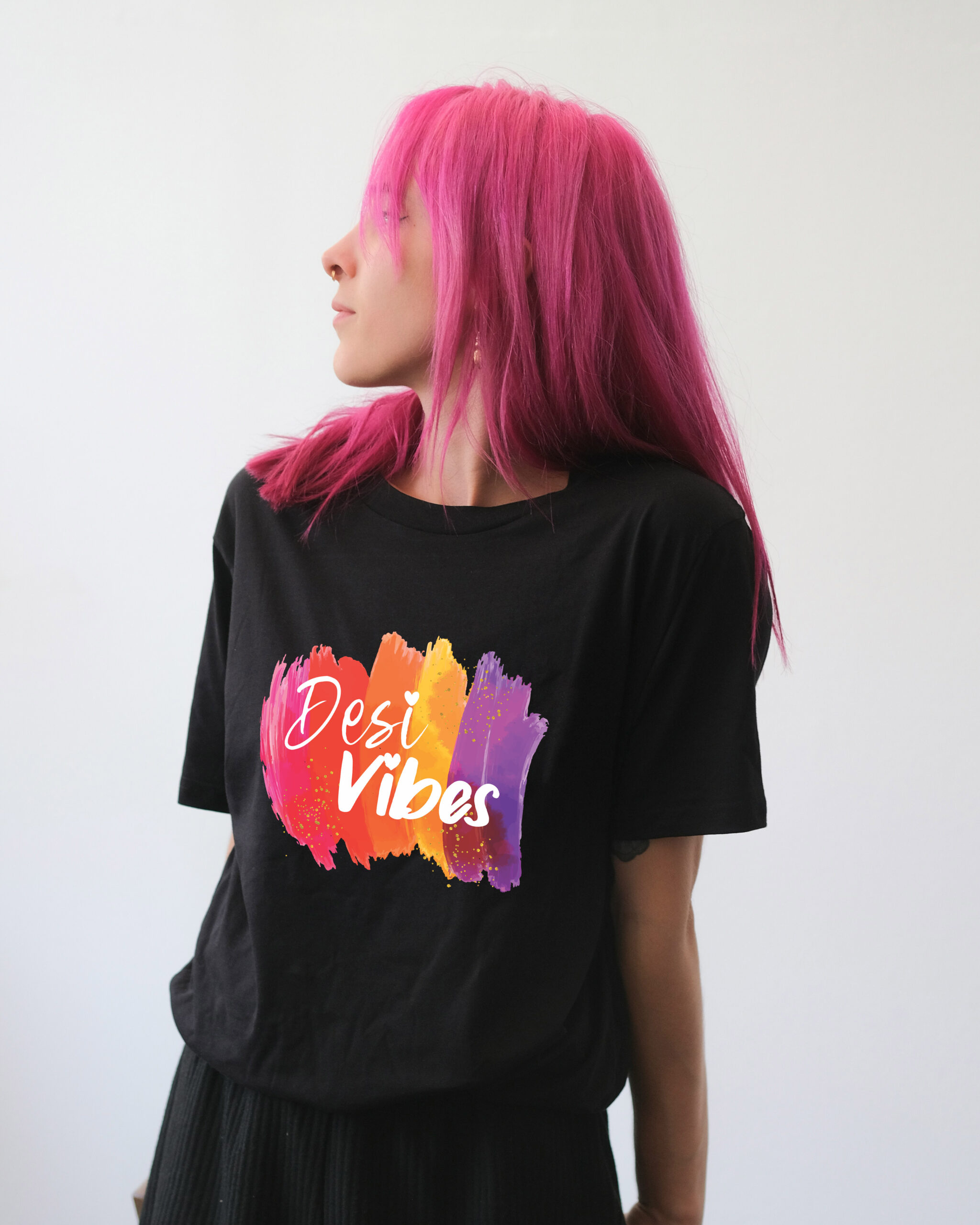 • Eye-catching multicolor brush-stroke design with “Desi Vibes” text
