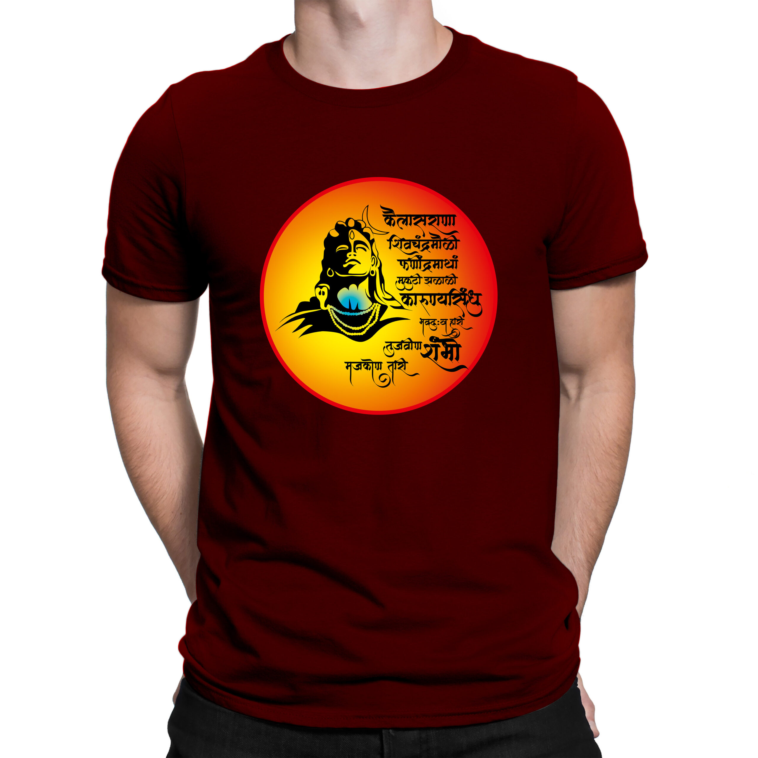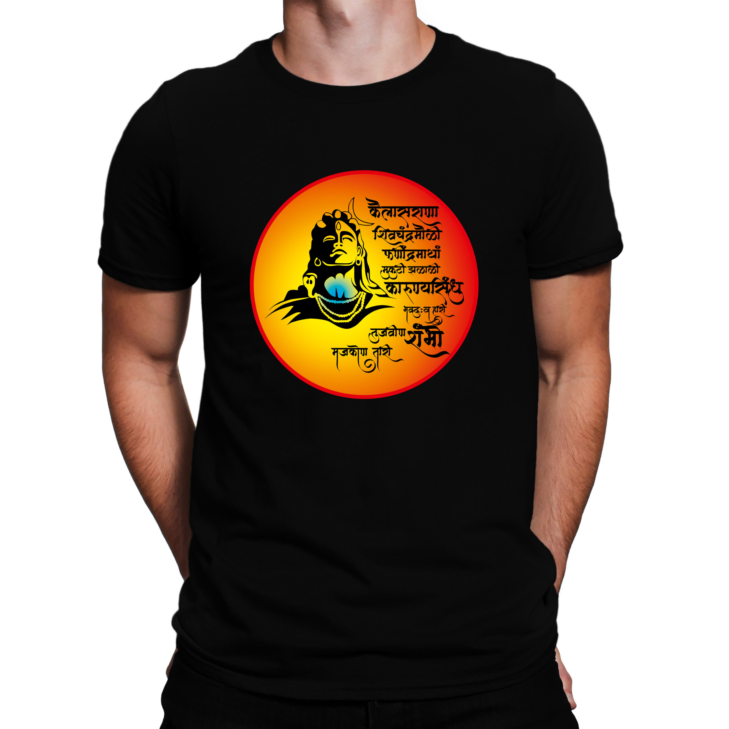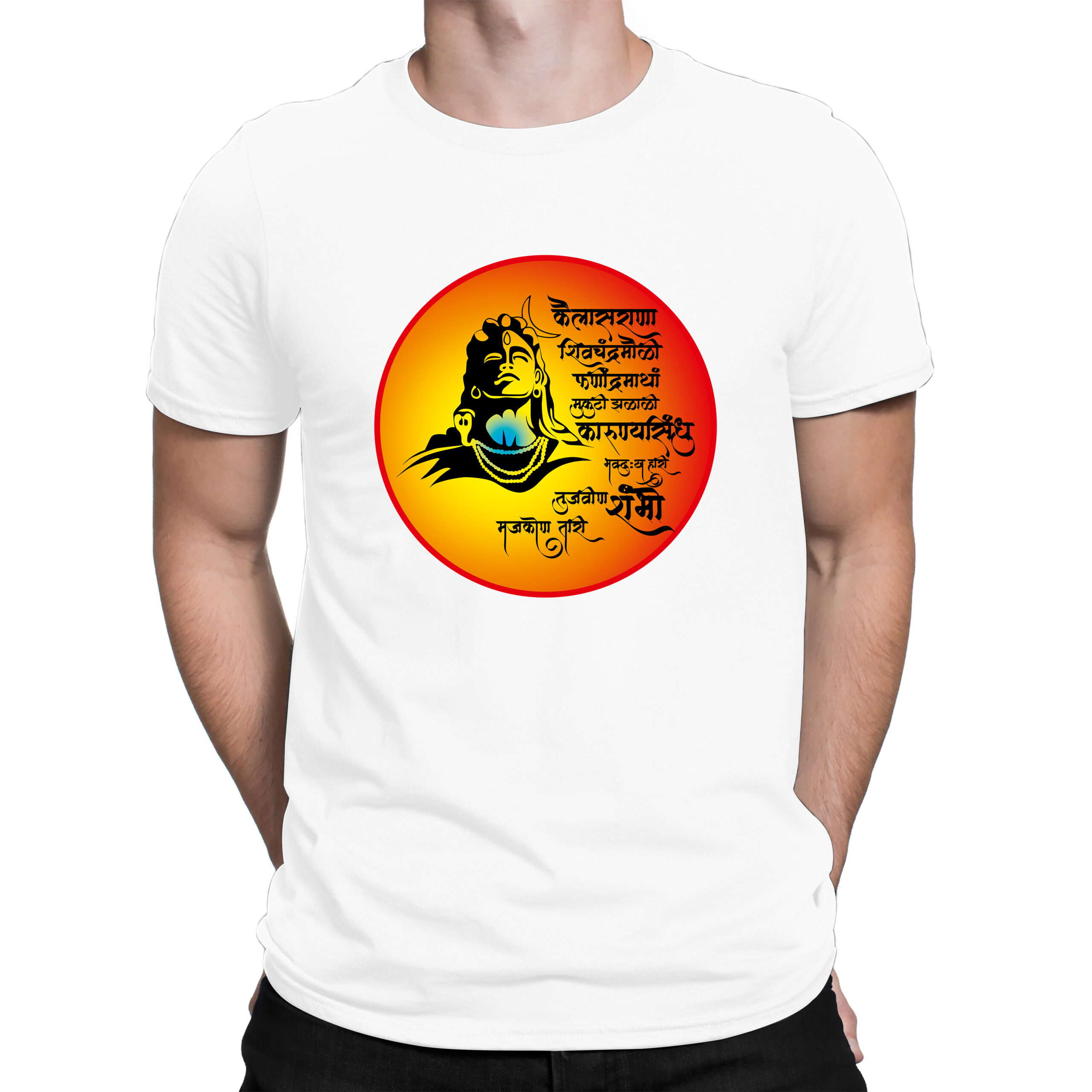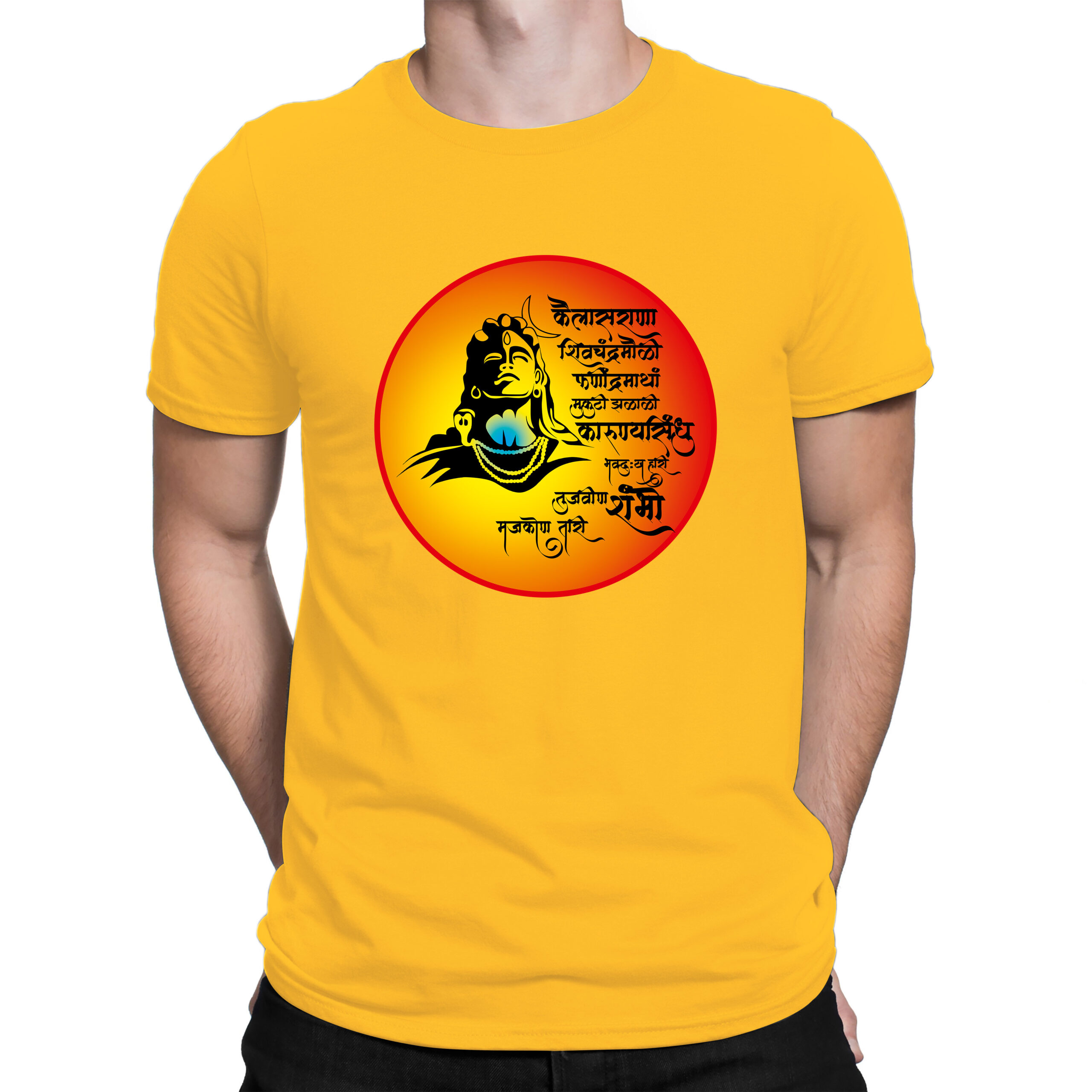 Immerse yourself in devotion with this spiritually charged Shambho tee. Designed with a radiant circular frame featuring a bold sketch of Lord Shiva and an empowering Marathi shloka, this t-shirt is a tribute to divine strength and inner peace. the fiery orange-yellow aura radiates devotion, energy, and fearless faith.