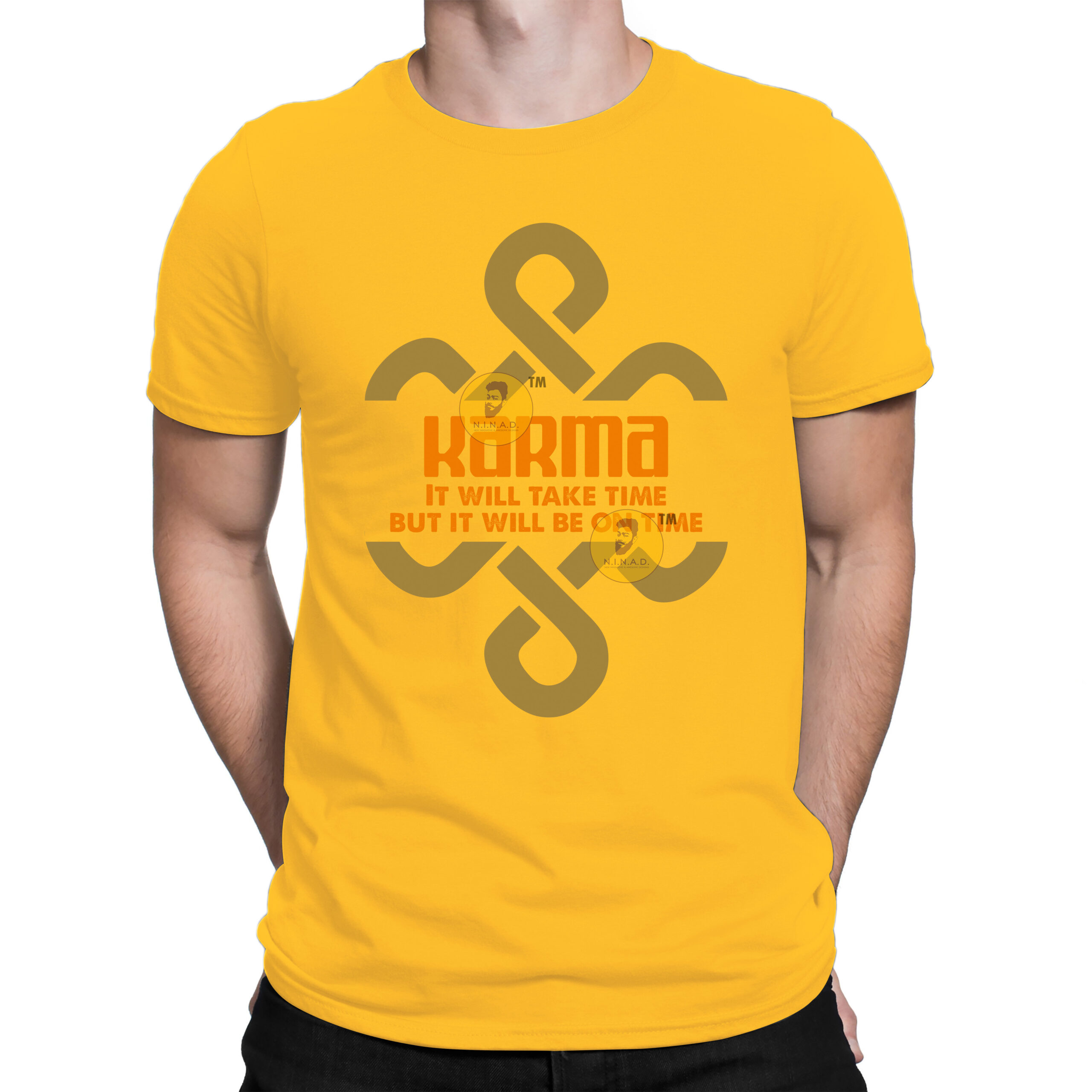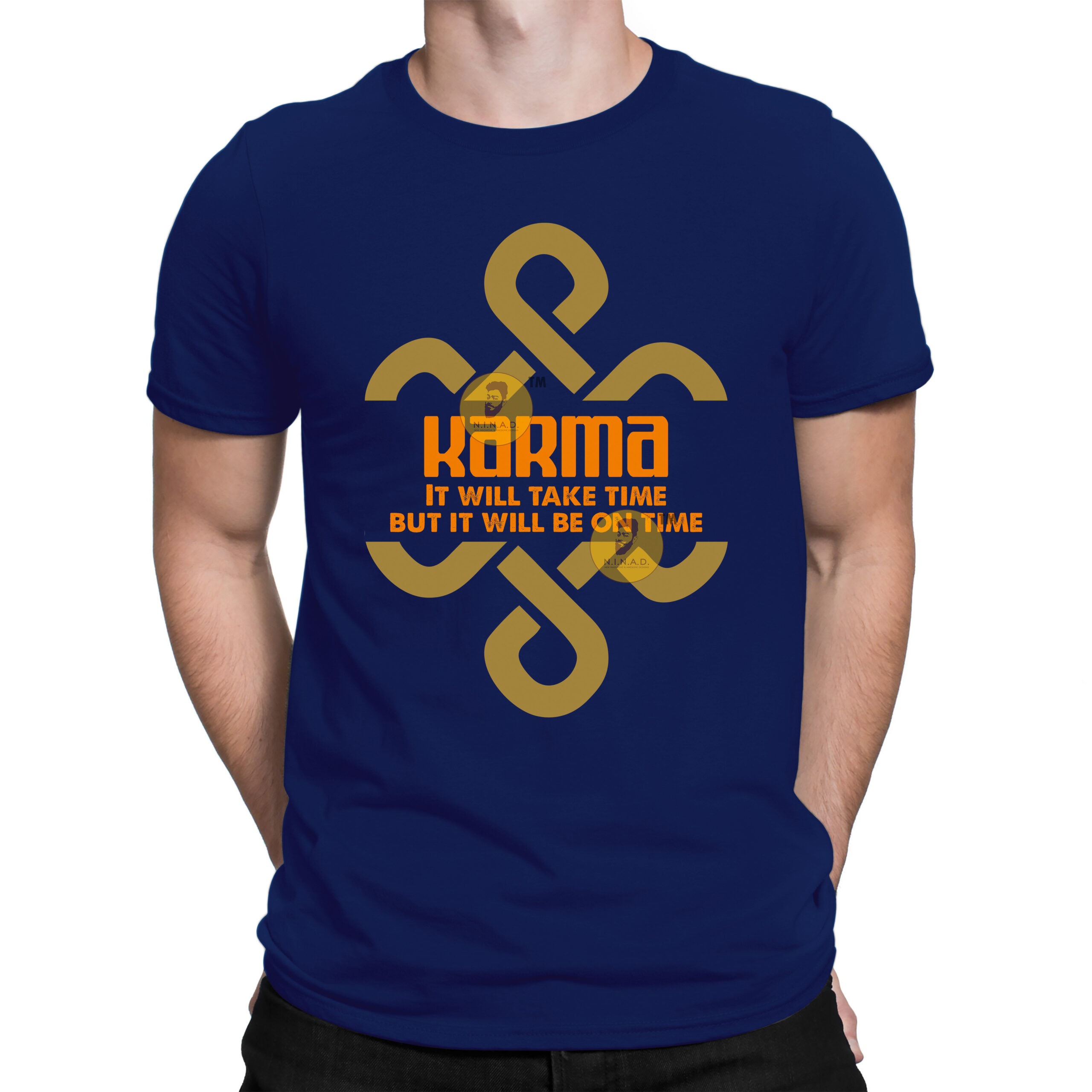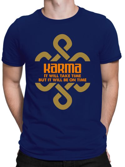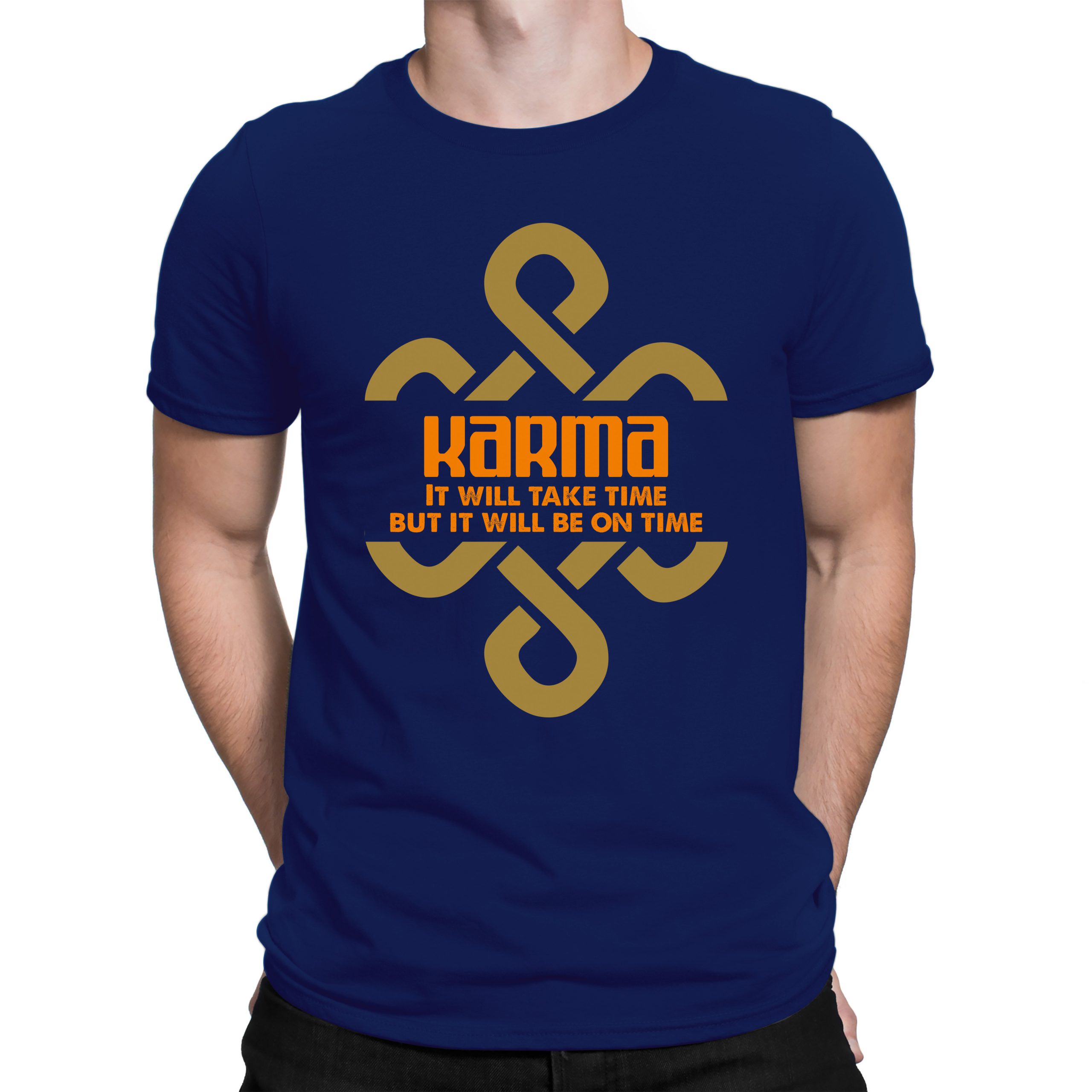 Patience meets power with our Karma T-shirt – a bold reminder that the universe keeps perfect score. Featuring a striking orange and gold print over a deep navy base, this tee carries the message:
