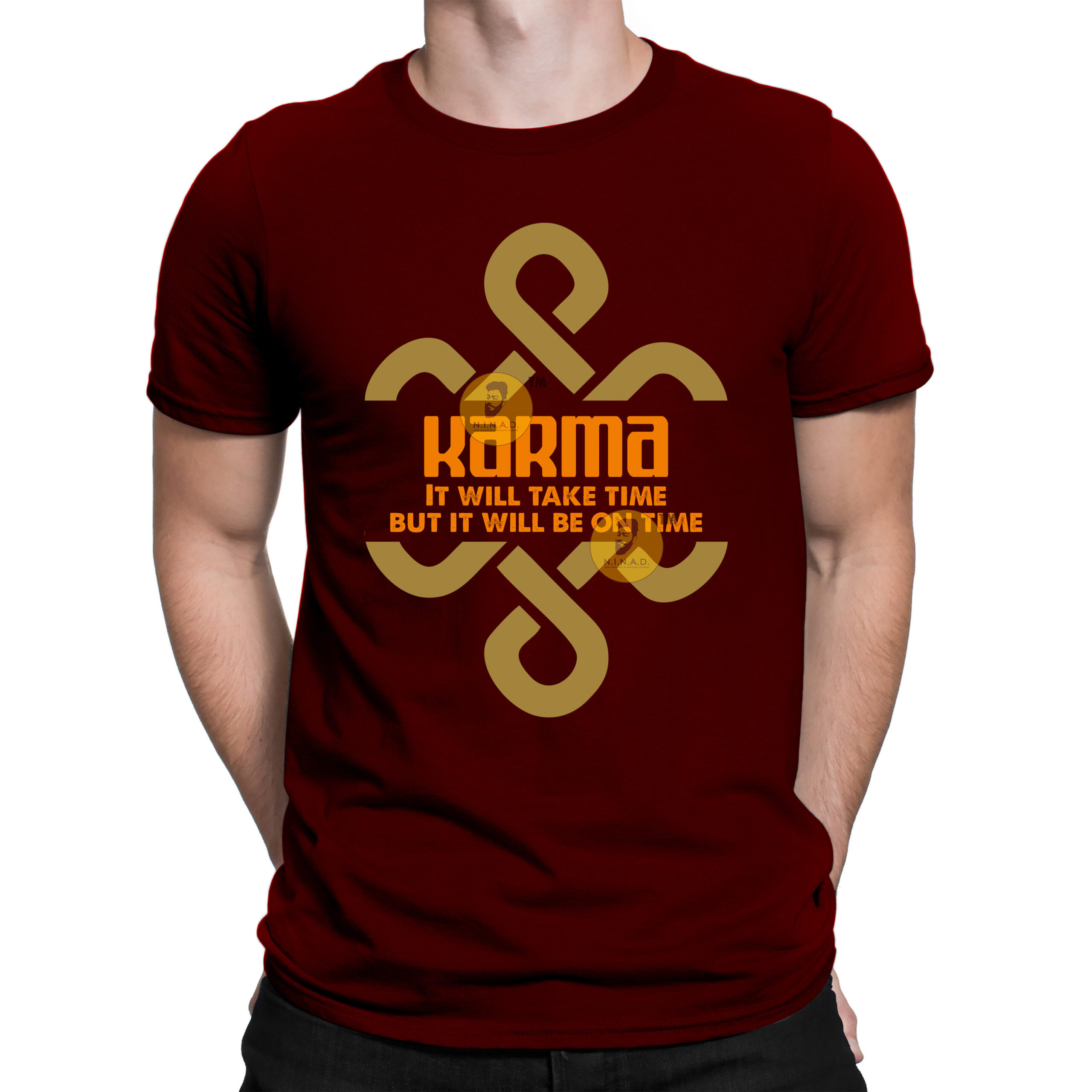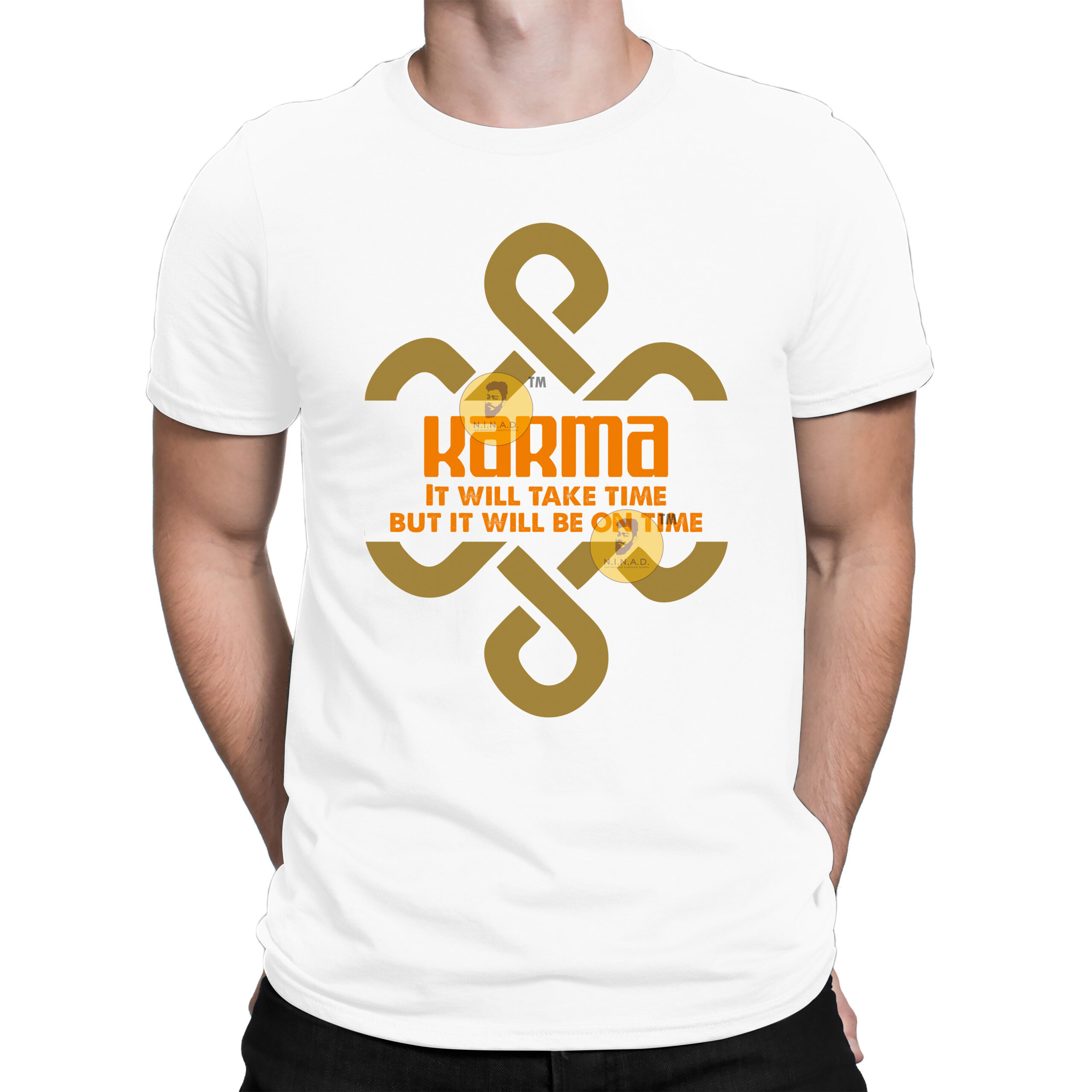 The geometric motif behind the text symbolizes eternity and the interconnectedness of all actions, making this shirt both stylish and spiritually grounded.