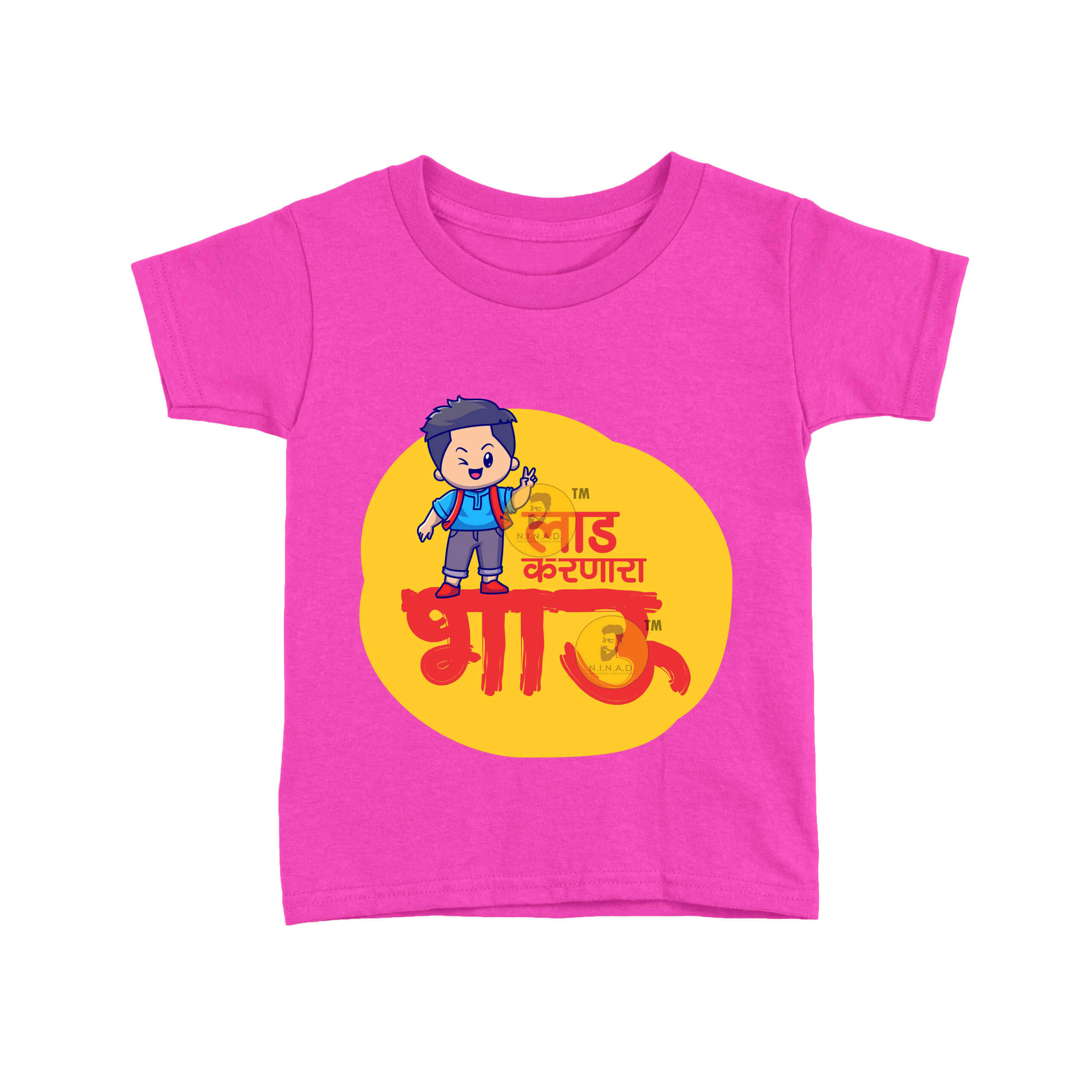 Bring out the loving, pampered side of your little brother with our “Laad Karnara Bhau” Kids T-Shirt. Featuring a cute animated boy illustration with bold Marathi typography, this tee perfectly showcases the adorable bond of a cherished brother.