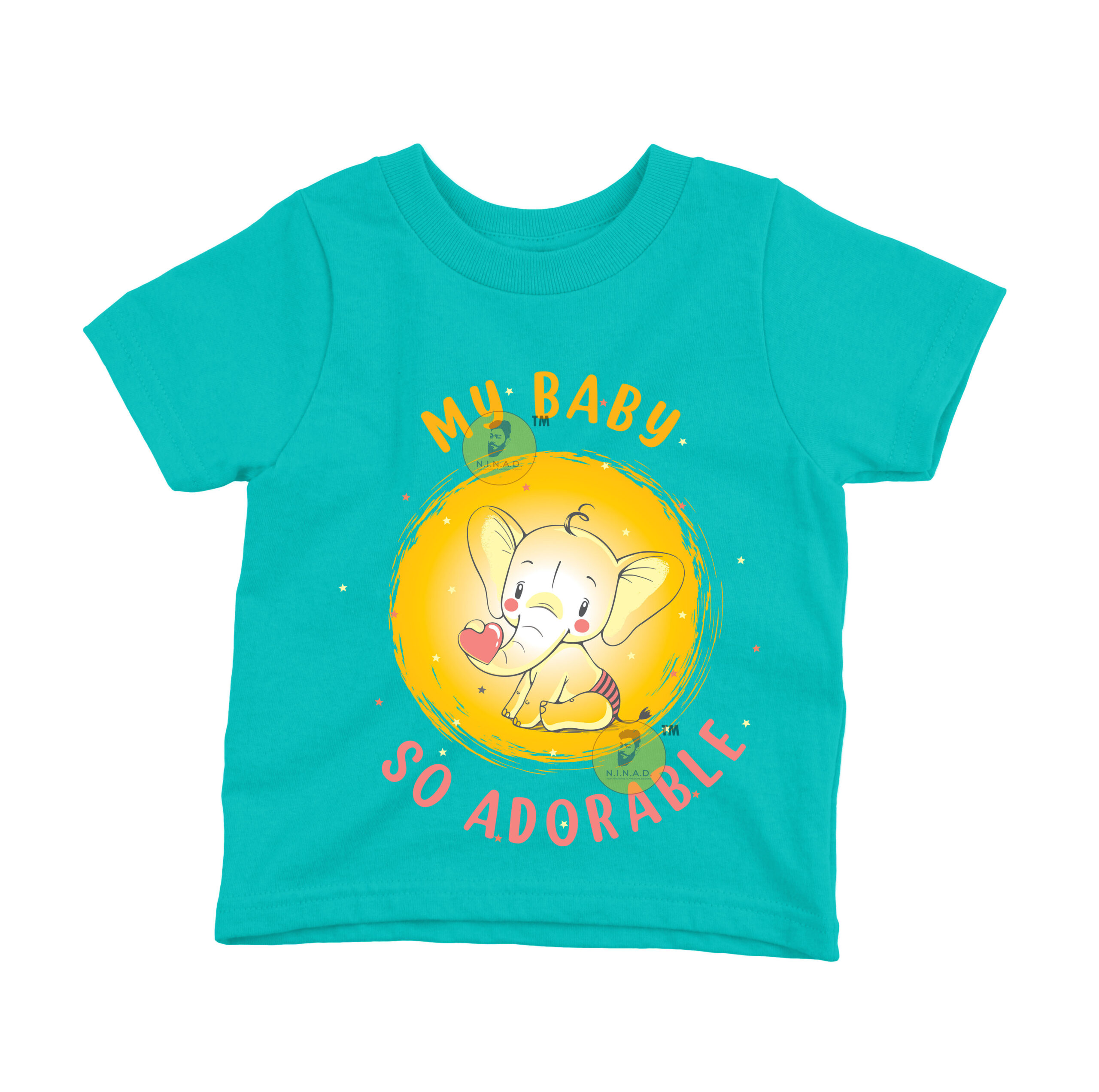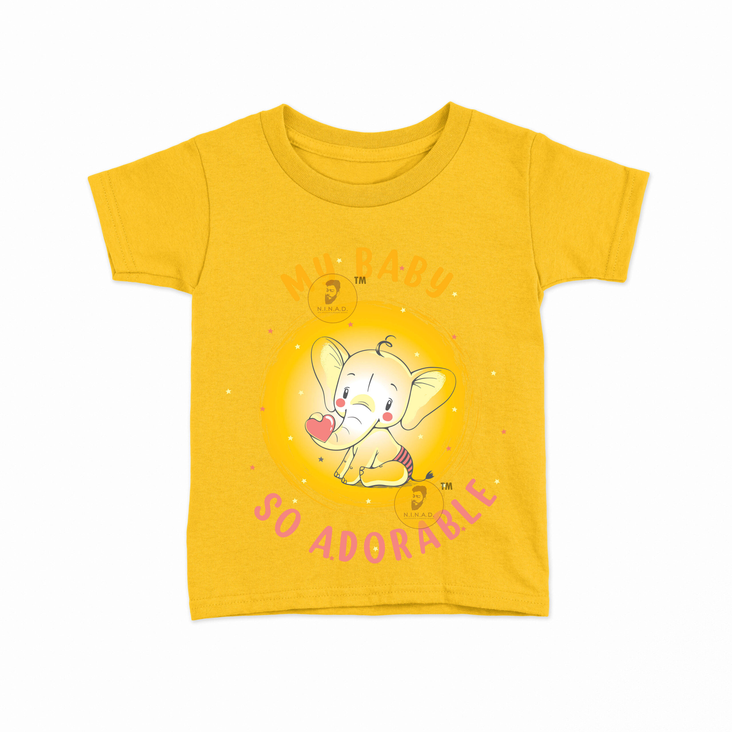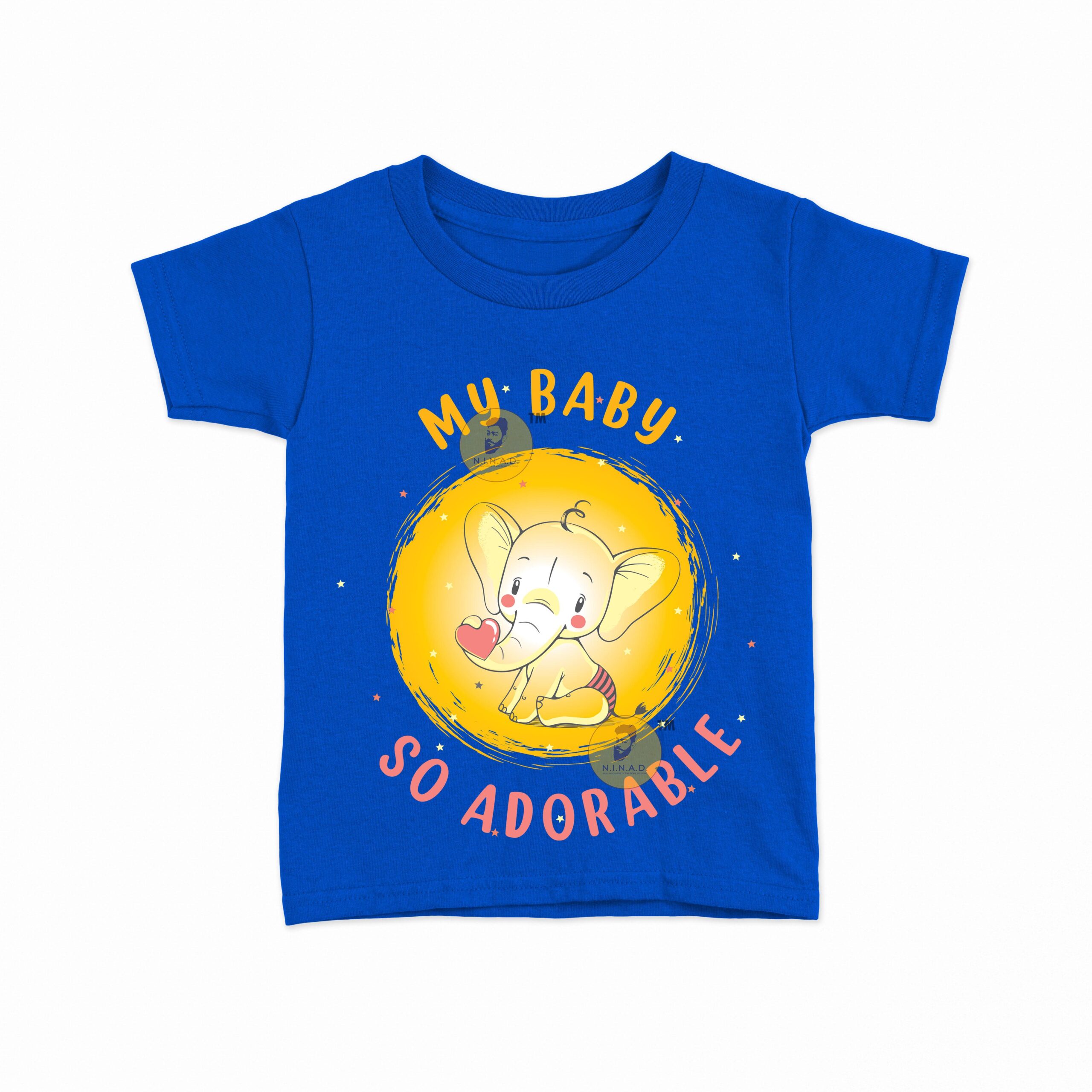 This sweet and charming T-shirt is designed with a cute baby elephant holding a heart, set against a glowing yellow backdrop. The text “My Baby So Adorable” in playful orange and pink fonts highlights the innocence and love every little one brings. With its soft, cheerful vibe, this T-shirt is perfect for celebrating your baby’s cuteness while keeping them comfortable.