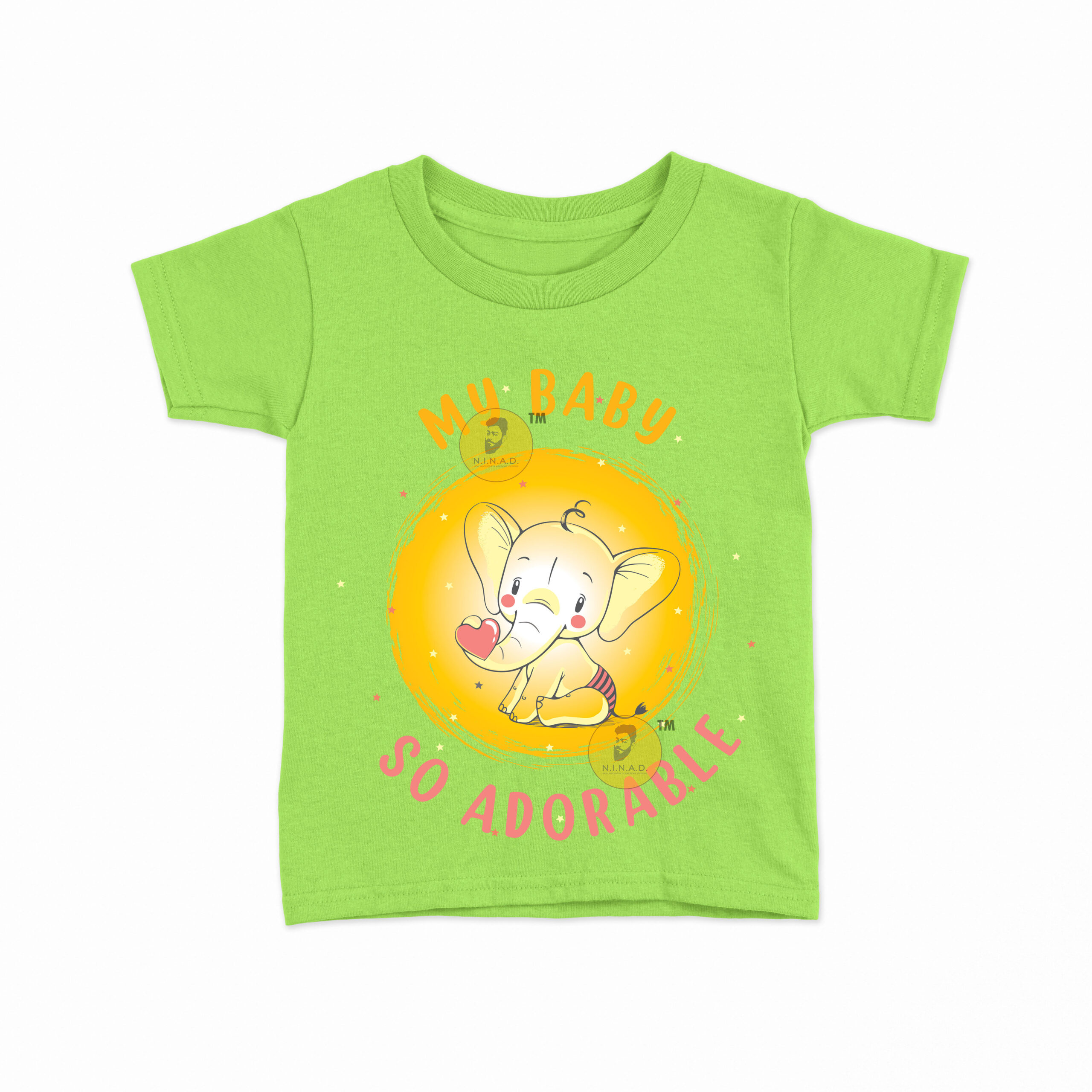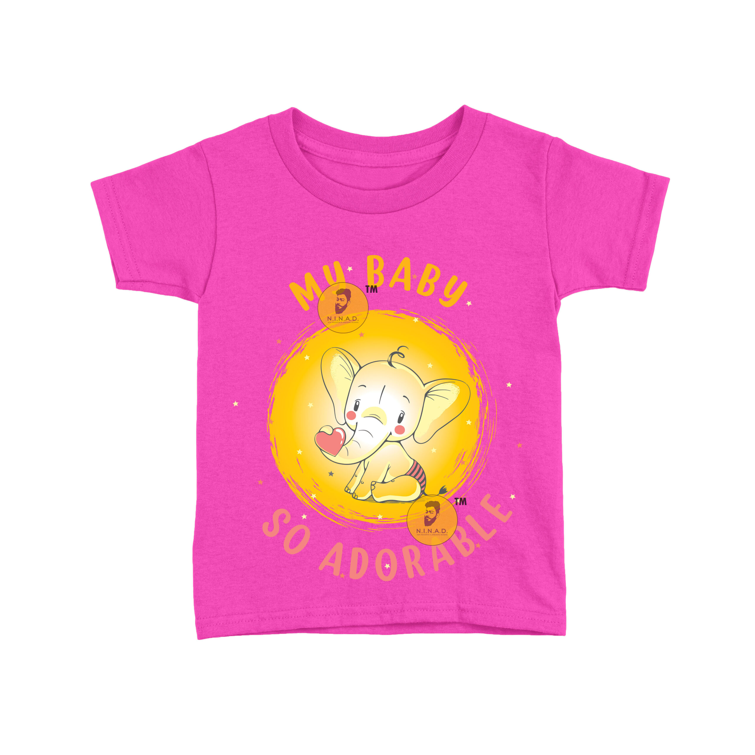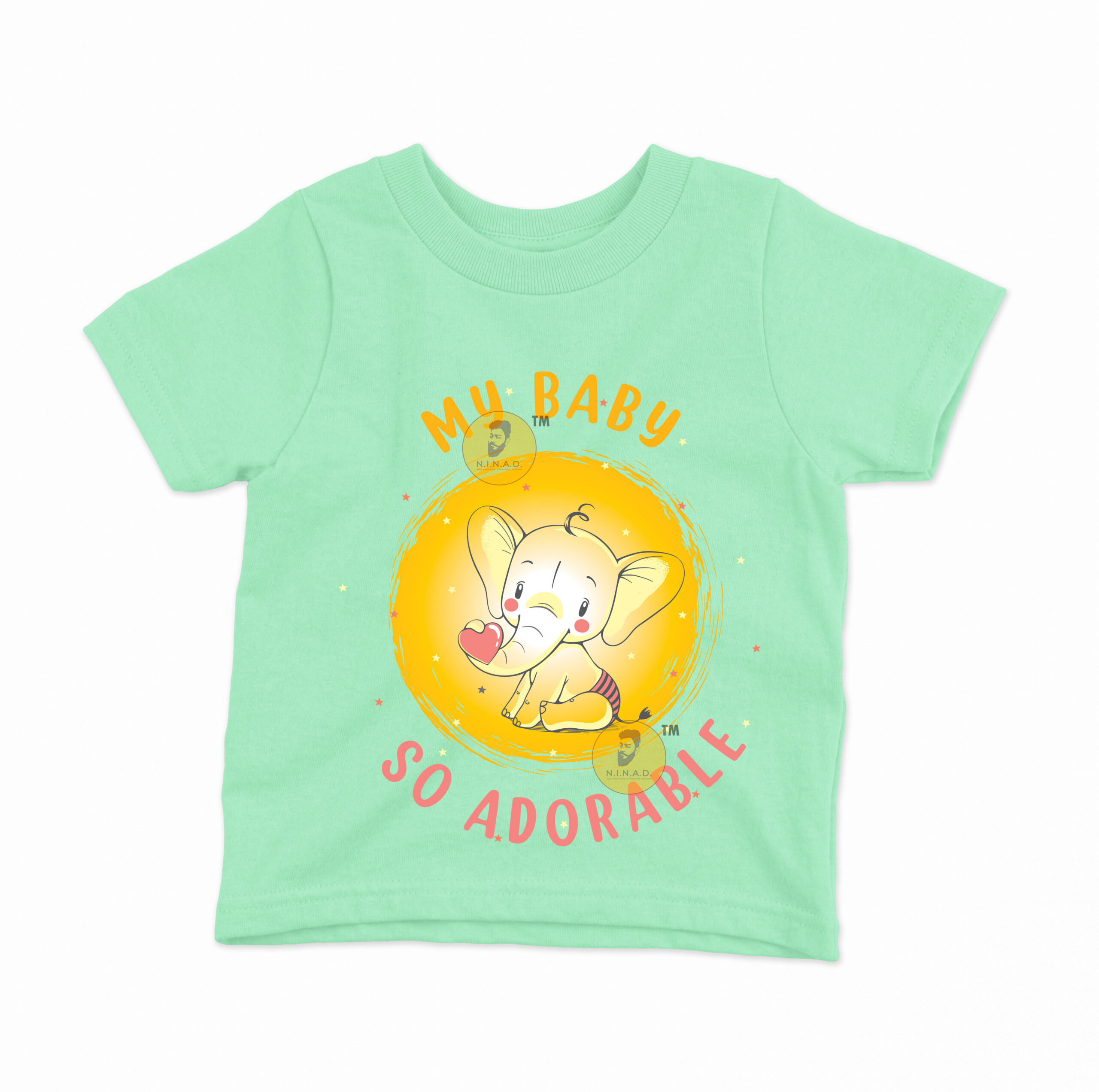 This sweet and charming T-shirt is designed with a cute baby elephant holding a heart, set against a glowing yellow backdrop. The text “My Baby So Adorable” in playful orange and pink fonts highlights the innocence and love every little one brings. With its soft, cheerful vibe, this T-shirt is perfect for celebrating your baby’s cuteness while keeping them comfortable.