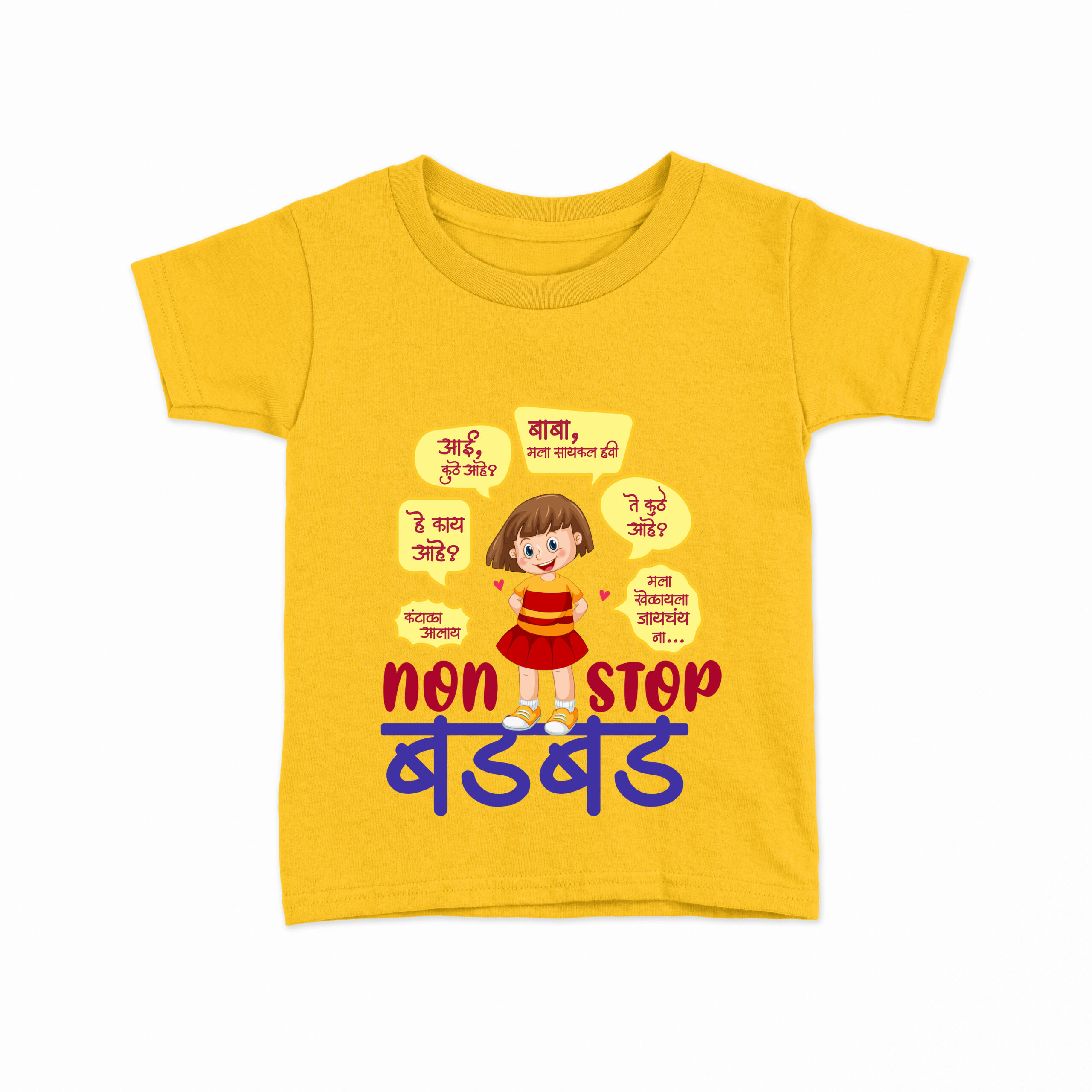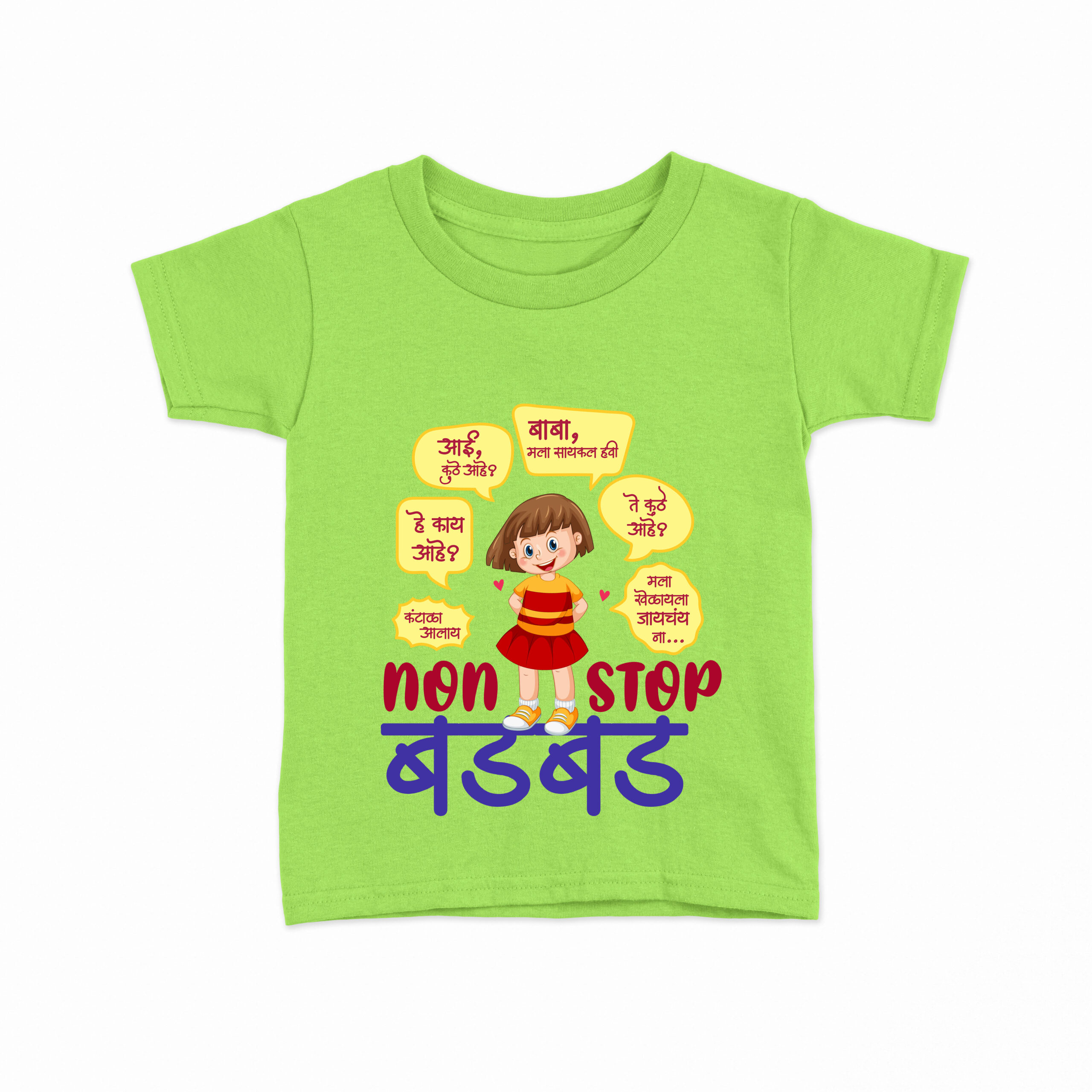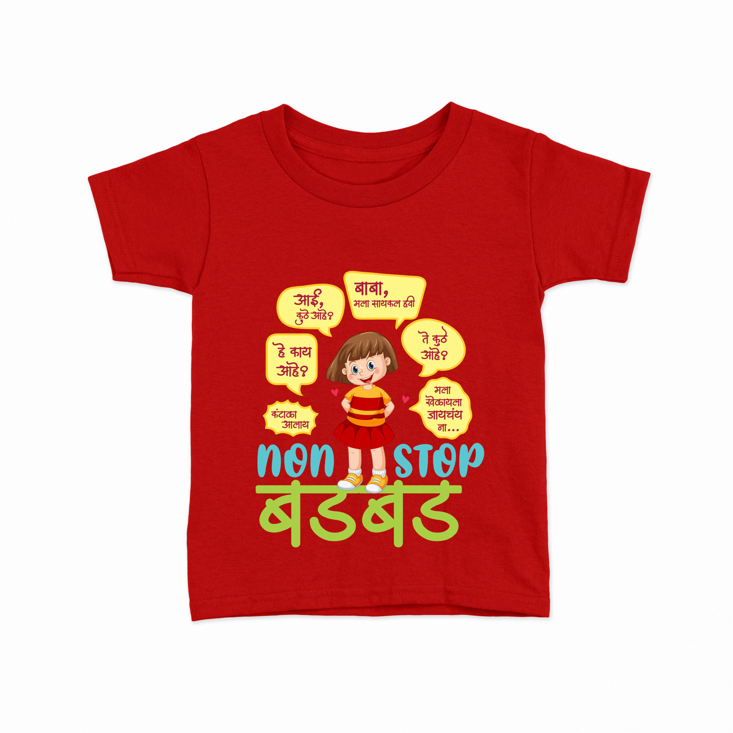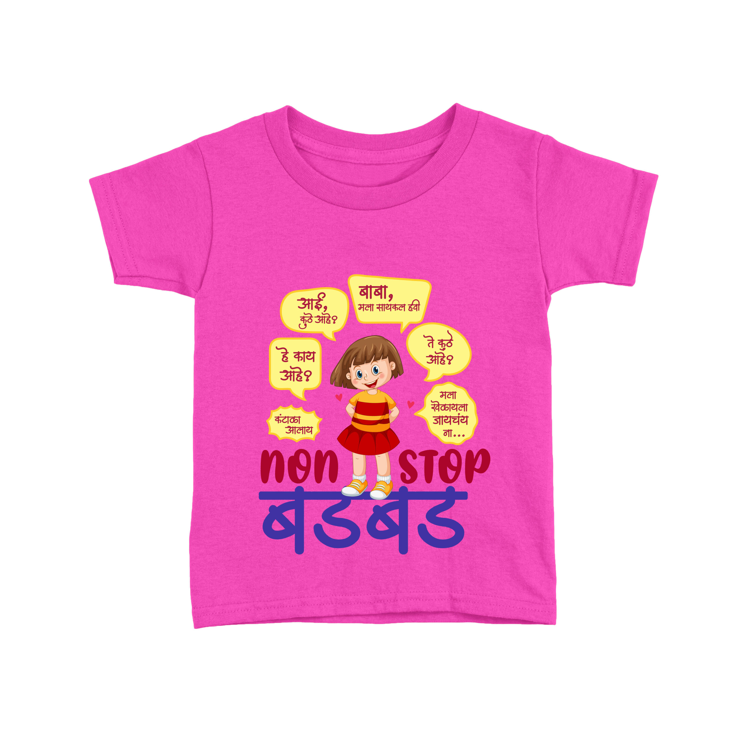 The Nonstop Badbad Girl T-Shirt is a cute and funny Marathi graphic tee for talkative kids. Perfect for playful, expressive little girls full of energy.
