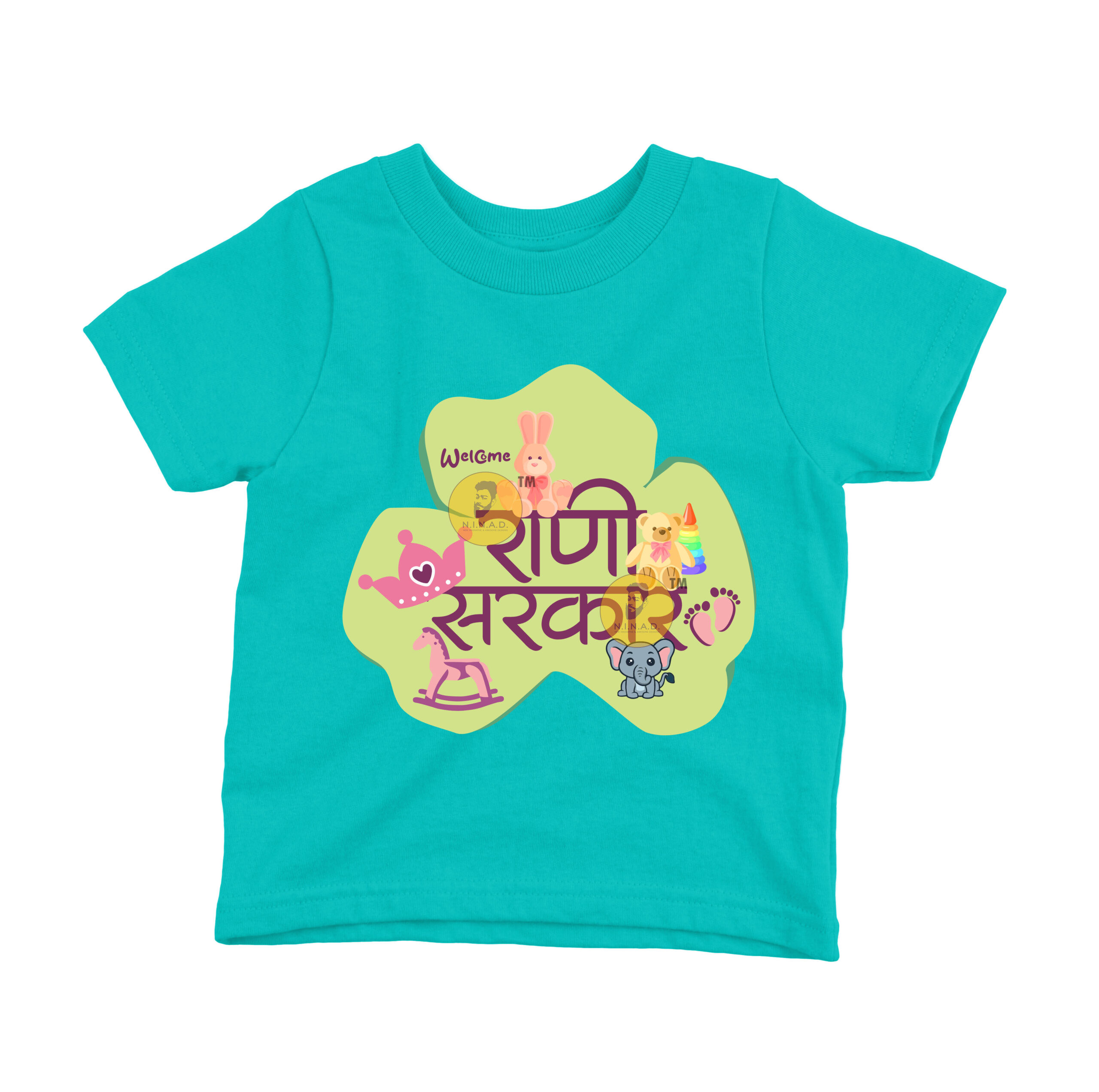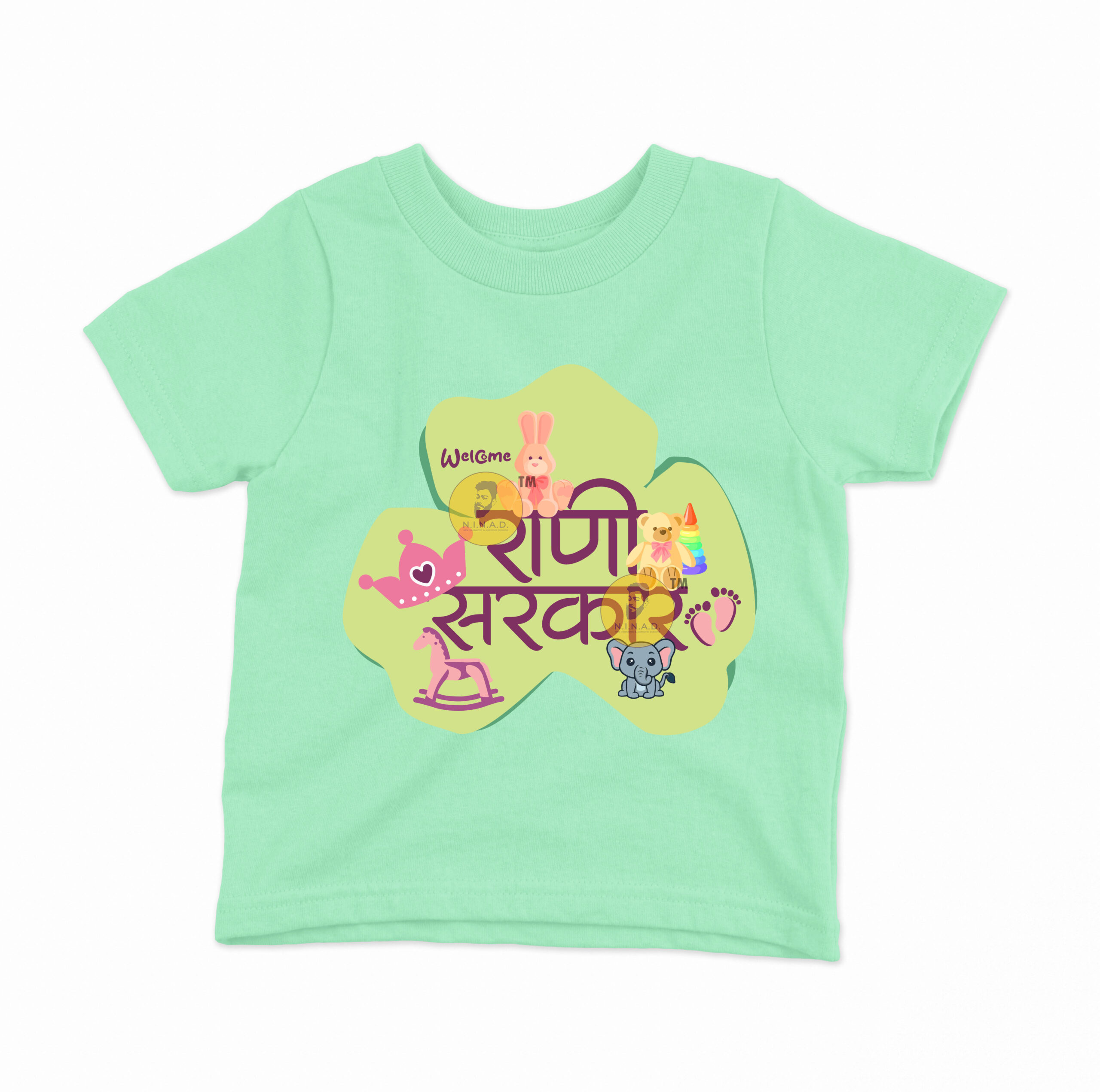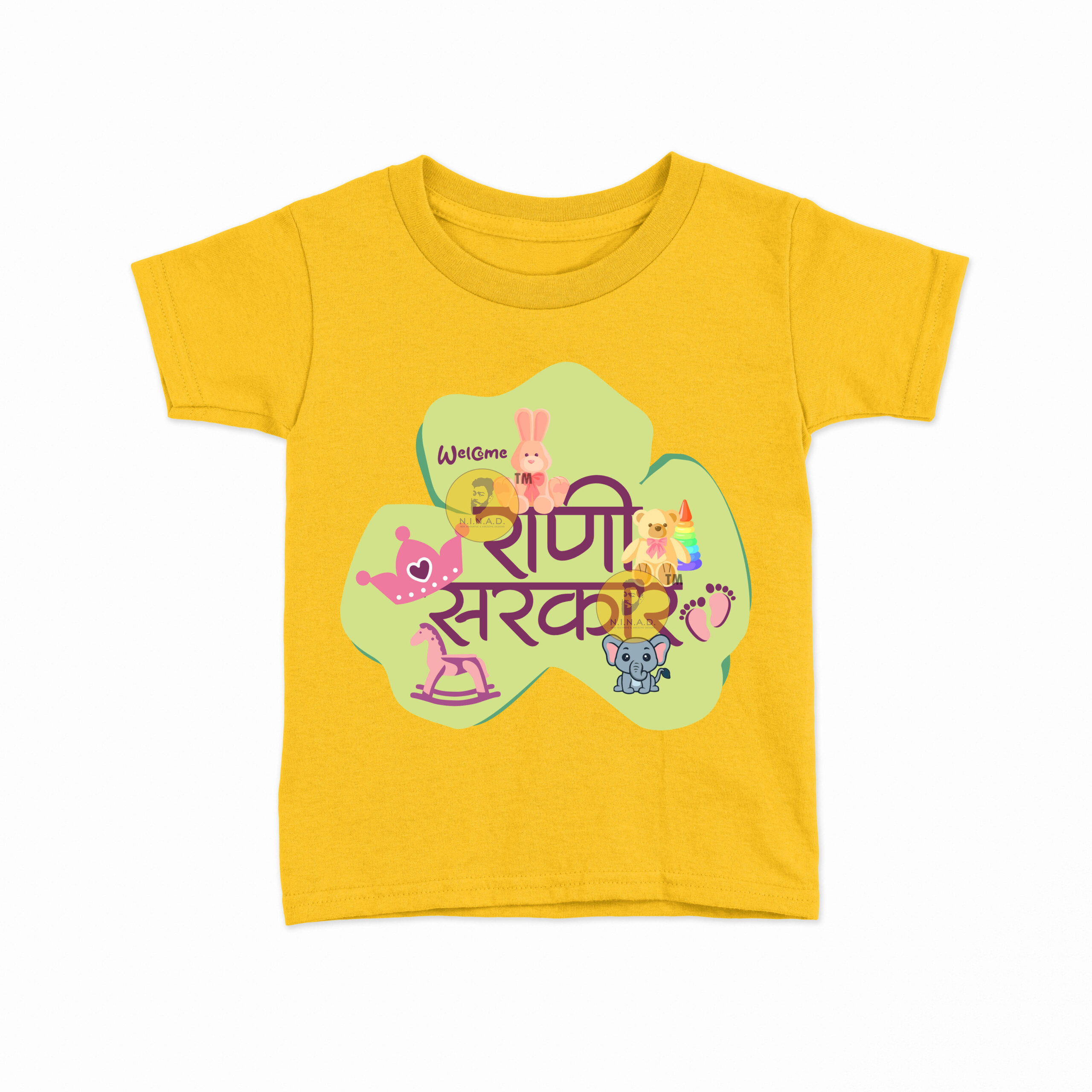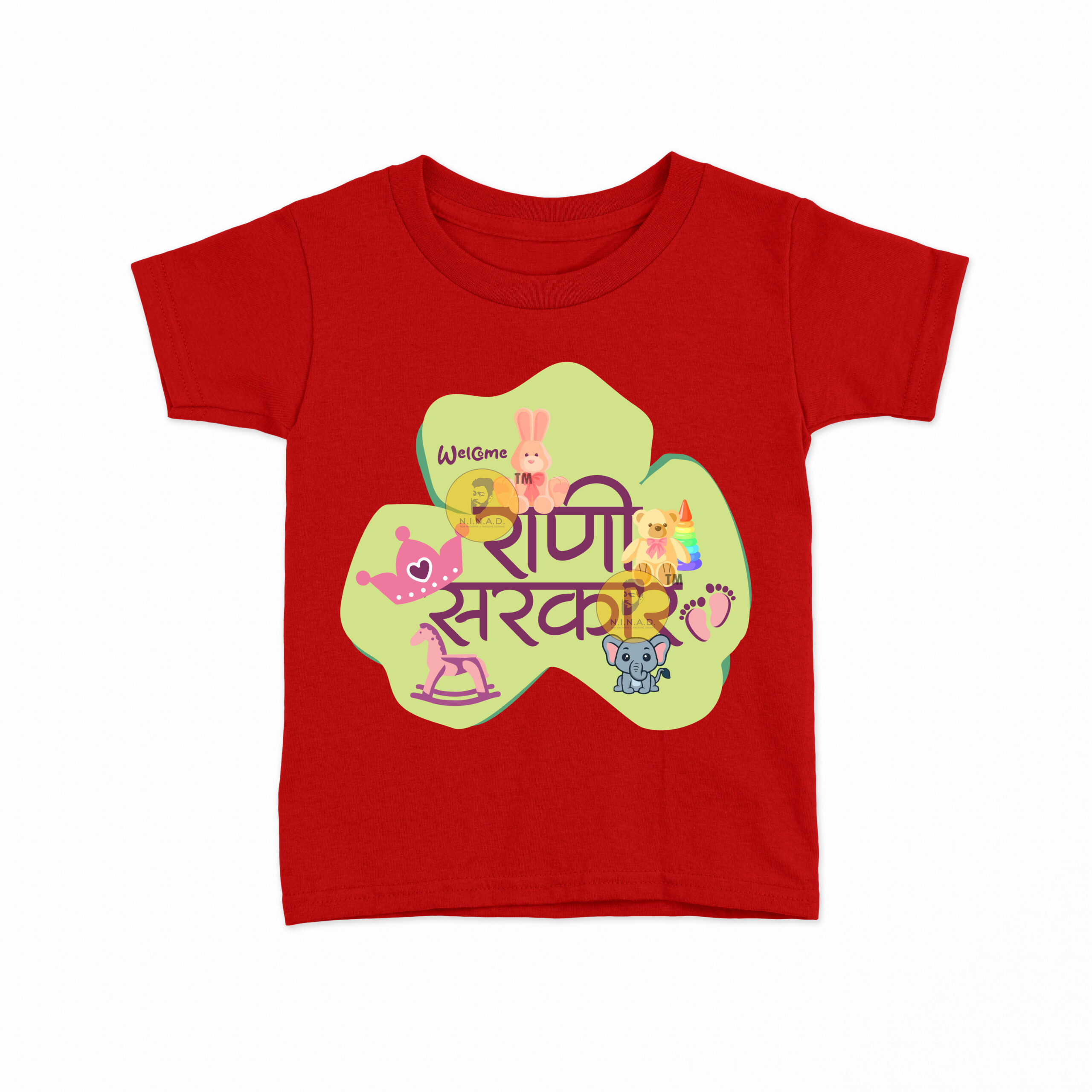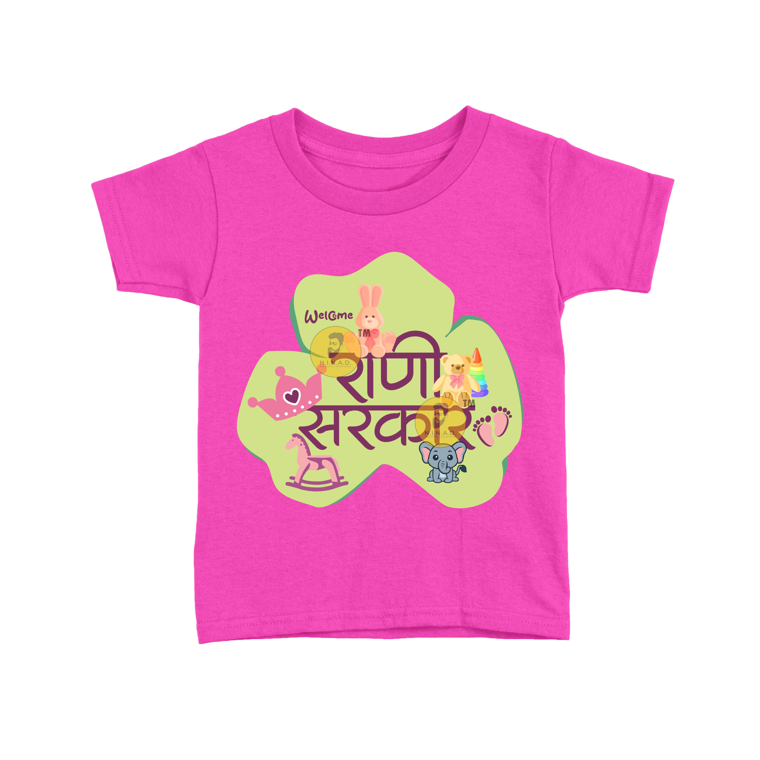 Celebrate your little princess with this adorable T-shirt featuring the Marathi slogan “राणी सरकार” (Queen’s Reign). The design is decorated with playful baby-themed graphics like a teddy, bunny, crown, rocking horse, tiny footprints, and a cheerful elephant — all coming together to welcome the little queen into her royal world. Perfect for everyday wear, family gatherings, or special baby photoshoots.