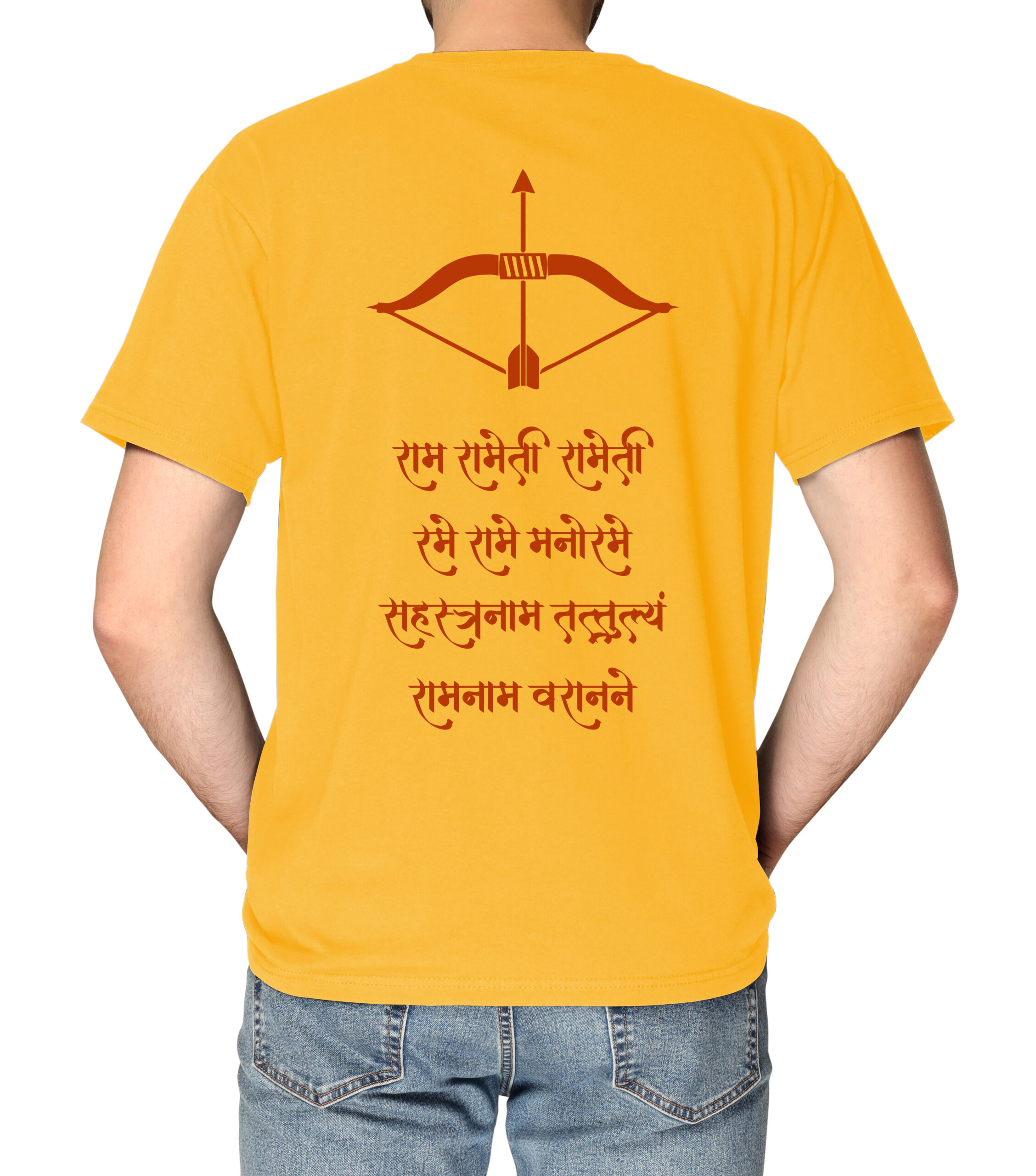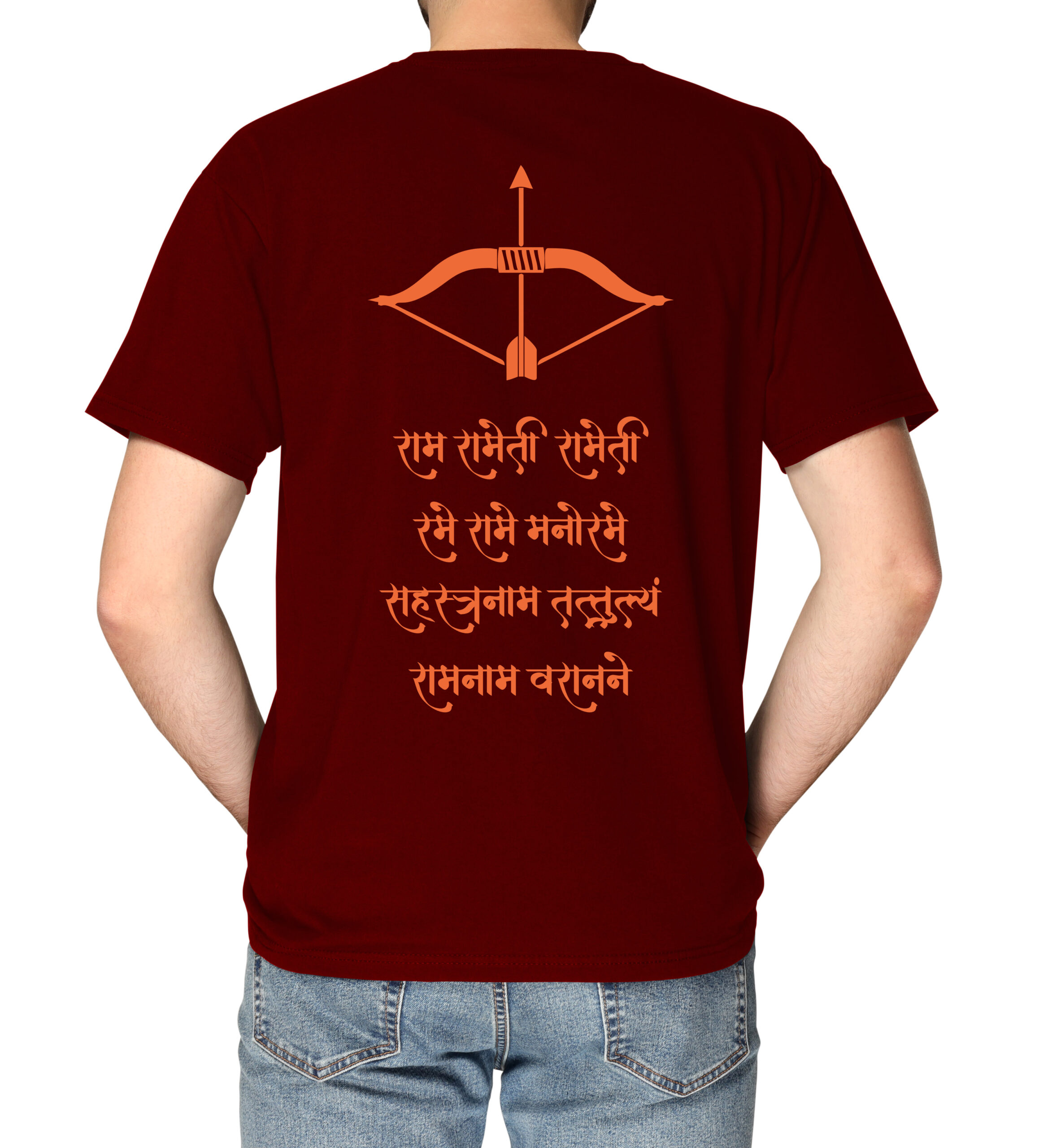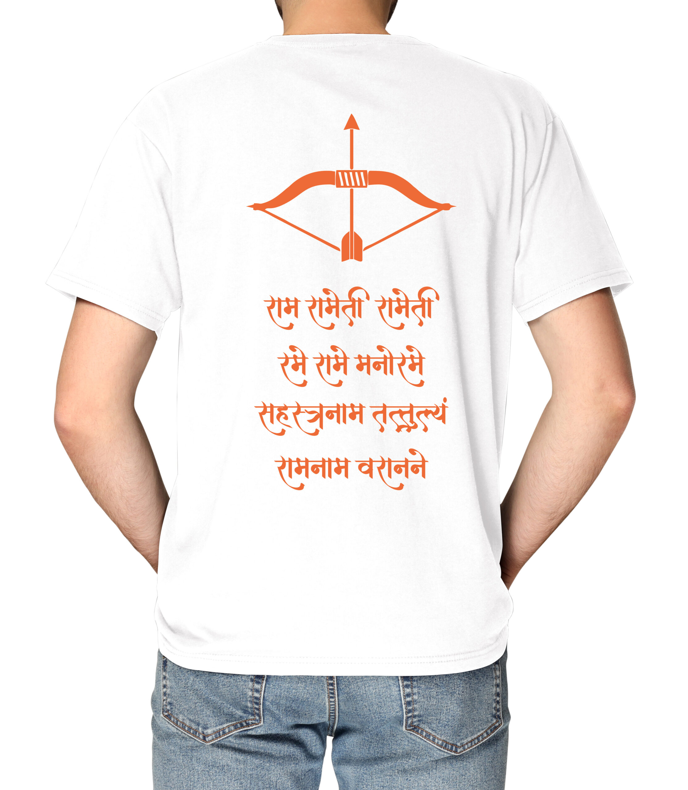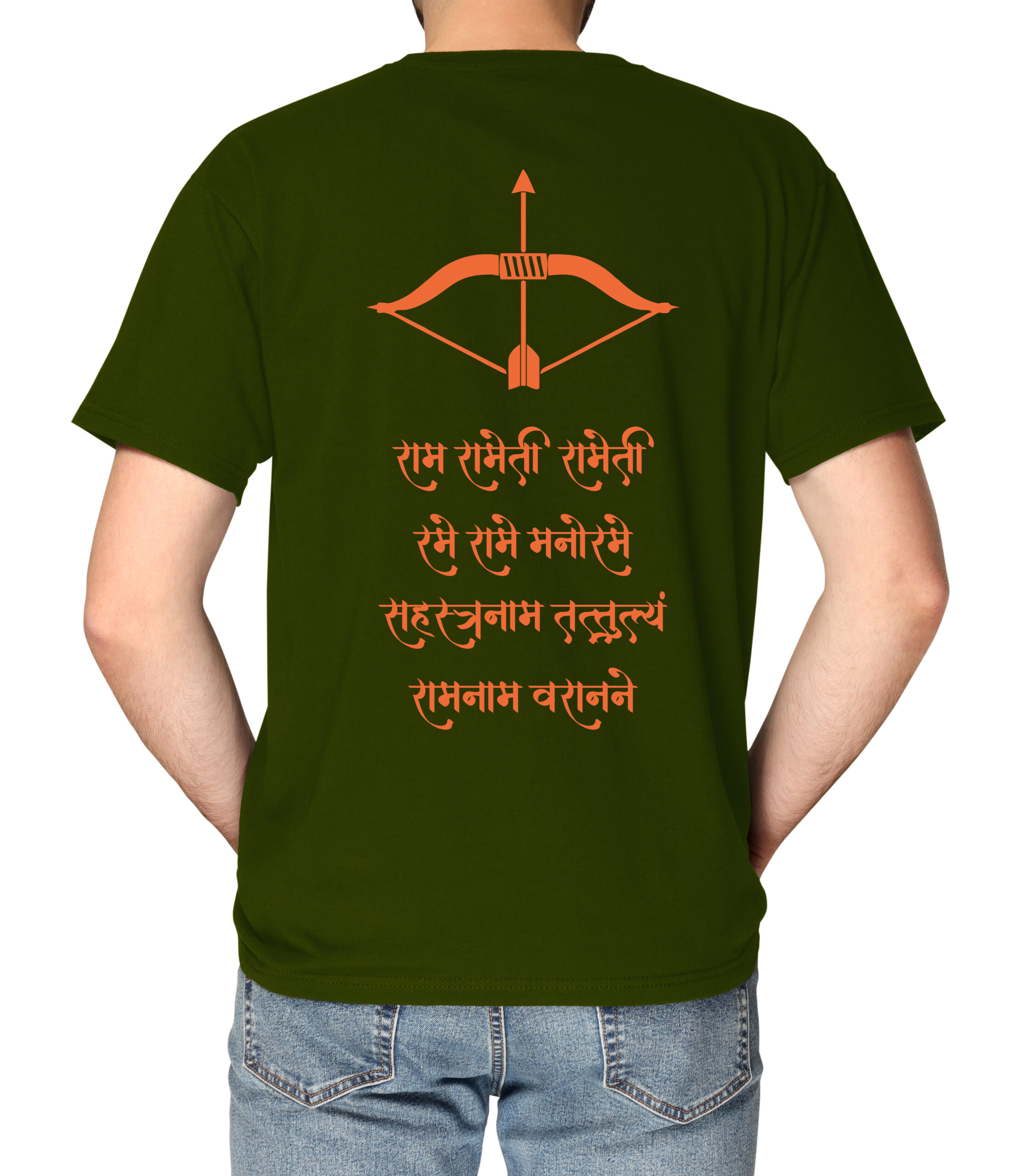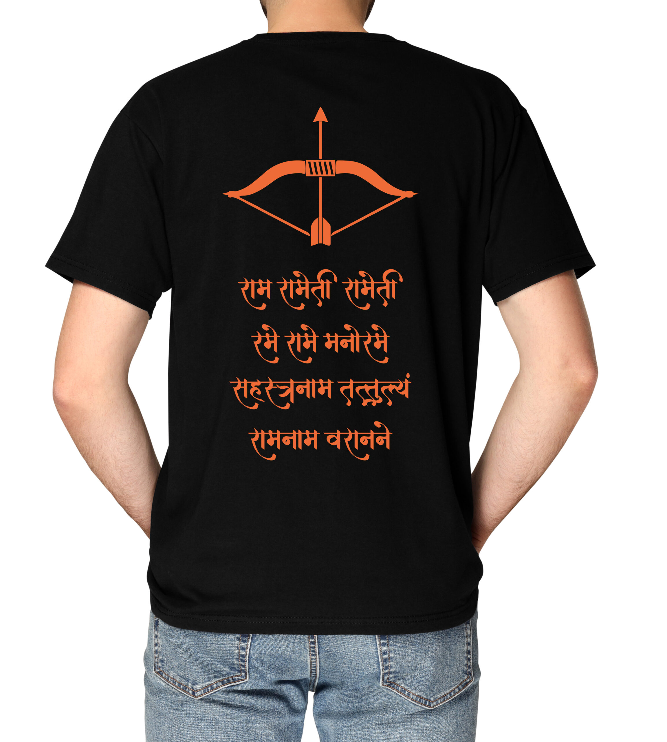 Our “Ram Naam – The Divine Chant Edition” T-shirt is an ode to the eternal strength and serenity of Lord Rama. The minimalist front design features the sacred chant “राम राम,” symbolizing purity, balance, and devotion.